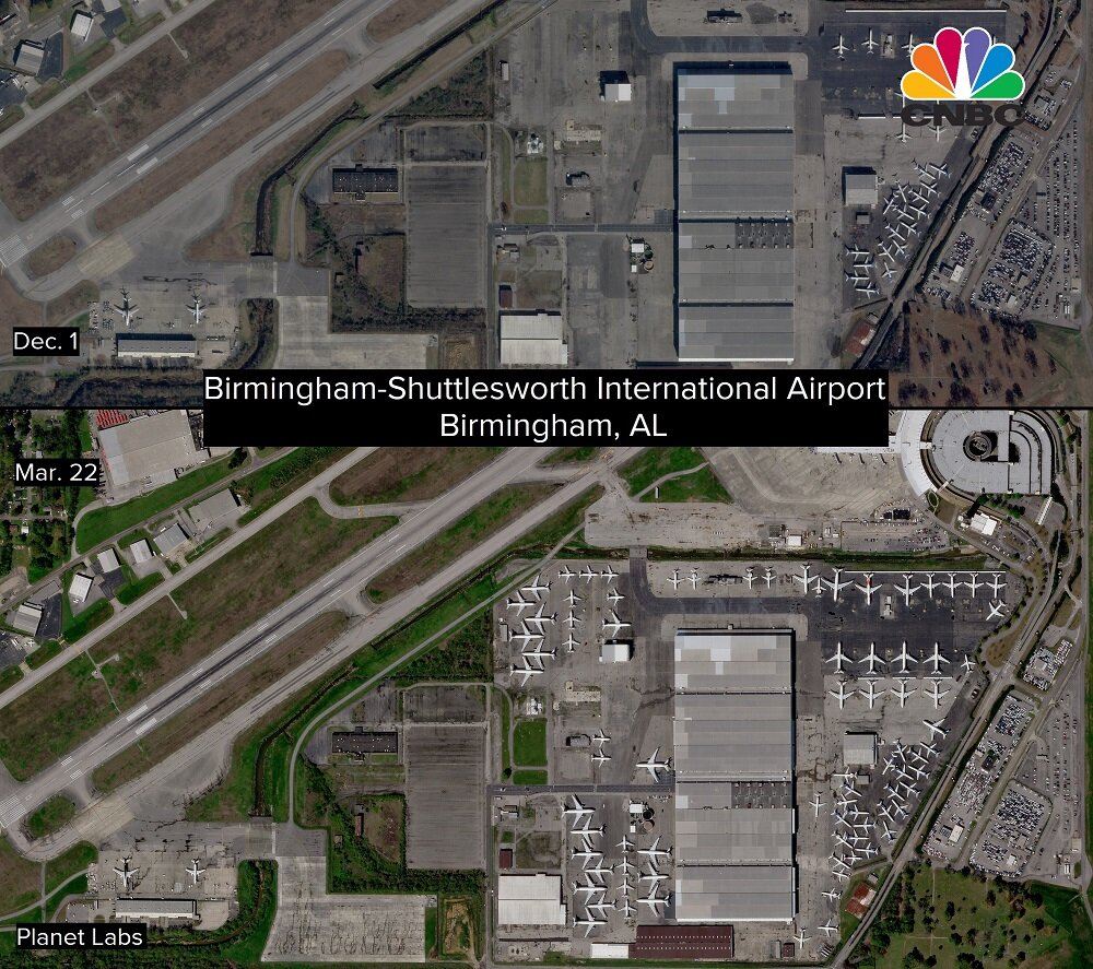 هواپیماهایی که در سراسر این کشور زمینگیر شدهاند. تصویر زیر هواپیماهای امریکن ایرلاین را نشان میدهد که در باندهای بلااستفاده فرودگاه بینالمللی تولسا پارک شدهاند.