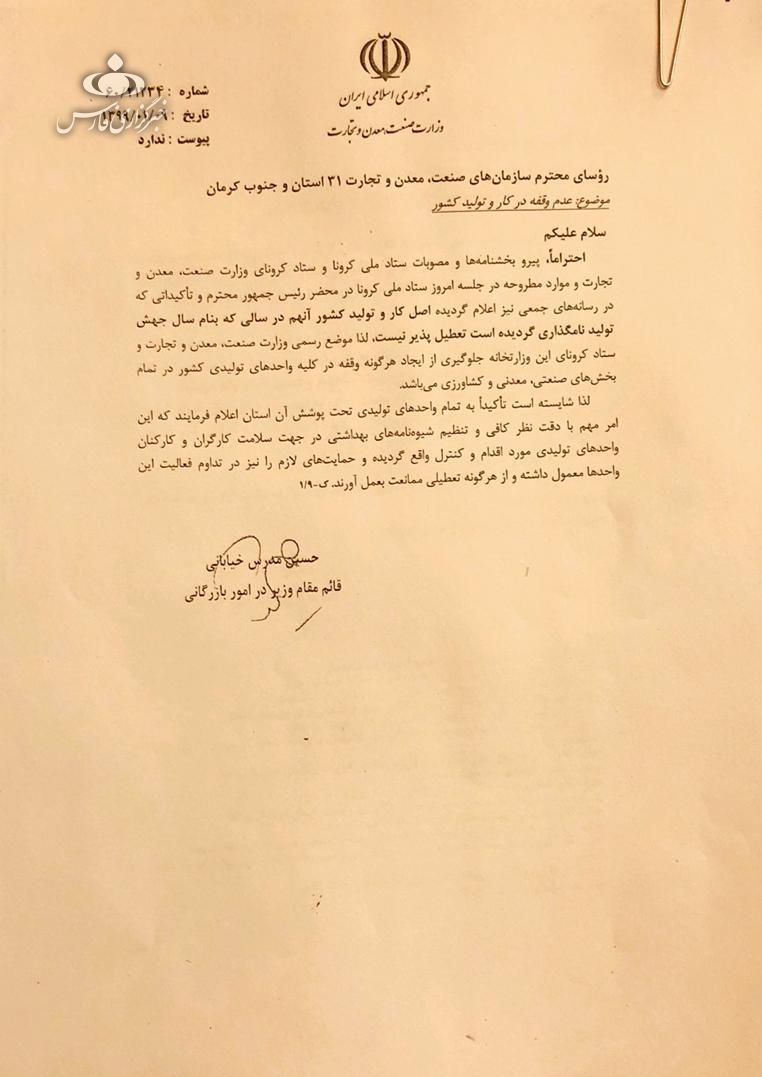 ماجرای اعتراض وزارت بهداشت به بازگشایی واحدهای تولیدی/ وزارت صنعت: به وزیر بهداشت اطلاعات غلط داده شده + سند