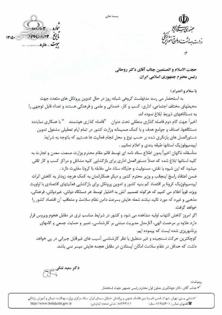 پیرو نامه قائممقام وزیر صنعت در خصوص آغاز به کار فعالیت واحدهای تولیدی، سعید نمکی وزیر بهداشت، درمان و آموزش پزشکی در نامهای به حسن روحانی رئیس جمهور درباره دستورالعمل ابلاغی وزارت صمت برای بازگشایی مشاغل و مراکز کسب و کار هشدار داد و نوشت: «اخیراً بدون اطلاع ستاد نامهای توسط قائممقام وزیر صنعت در امور بازرگانی به کلیه استانها ابلاغ شده که عملاً دستورالعمل اداری برای بازگشایی کسب و کار تلقی میشود که این شیوه با نقش، مسؤولیت و جایگاه ستاد ملی مقابله با کرونا مغایرت دارد.