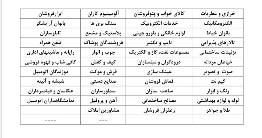 اسامی واحدهای صنفی که تا اطلاع ثانوی تعطیل هستند اعلام شد.