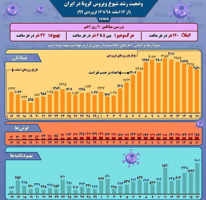 گسترش شیوع ویروس کرونا بیش از ۲۰۰ کشور جهان را درگیر کرده است. این ویروس تا ظهر شنبه (۱۶ فروردین ۹۹) ۳۴۵۲ نفر را در ایران به کام مرگ کشانده است. از سوی دیگر، بیش از ۱۹ هزار و ۷۰۰ نفر در ایران تاکنون بهبود یافتهاند. بررسی آمارهای وزارت بهداشت در ۱۰ روز اخیر یعنی از ۷ تا ۱۶ فروردین ۹۹ نشان میدهد که به طور متوسط در هر ساعت، ۱۲۰ نفر (به طور میانگین هر دقیقه ۲ نفر) در ایران مبتلا و بین ۵ تا ۶ نفر قربانی این ویروس میشوند و البته هر ساعت ۴۲ نفر بهبود مییابند.