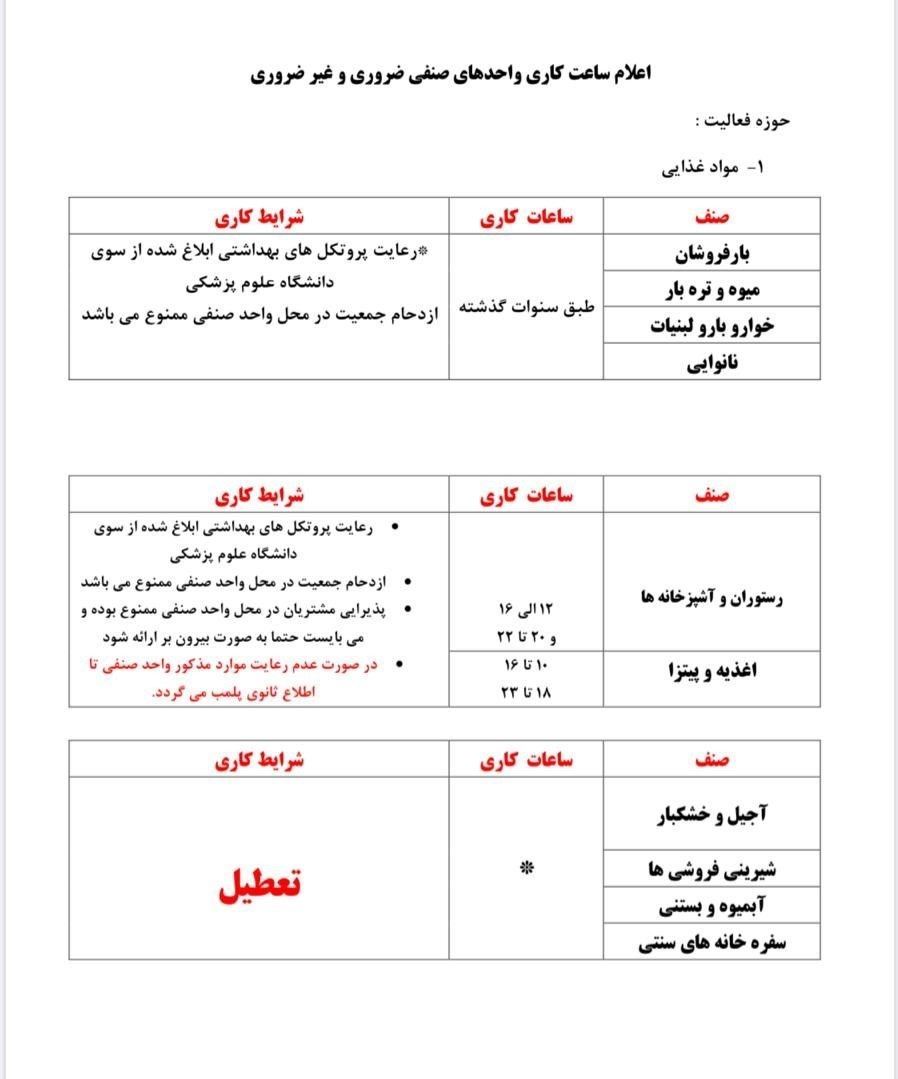 ساعت کاری واحدهای صنفی مواد مصرفی و غذایی و یا خدماتی مورد نیاز مردم در دروه کرونا اعلام شد.