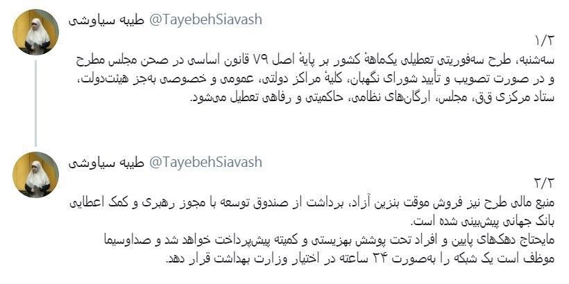 طبیه سیاوشی در رشته توئیتش نوشت: «سهشنبه، طرح سه فوریتی یک ماهه کشور بر پایهٔ اصل ۷۹ قانون اساسی در صحن مجلس مطرح و در صورت تصویب و تأیید شورای نگهبان، کلیهٔ مراکز دولتی، عمومی و خصوصی بهجز هیئتدولت، ستاد مرکزی قوه قضائیه، مجلس، ارگانهای نظامی، حاکمیتی و رفاهی تعطیل میشود.»