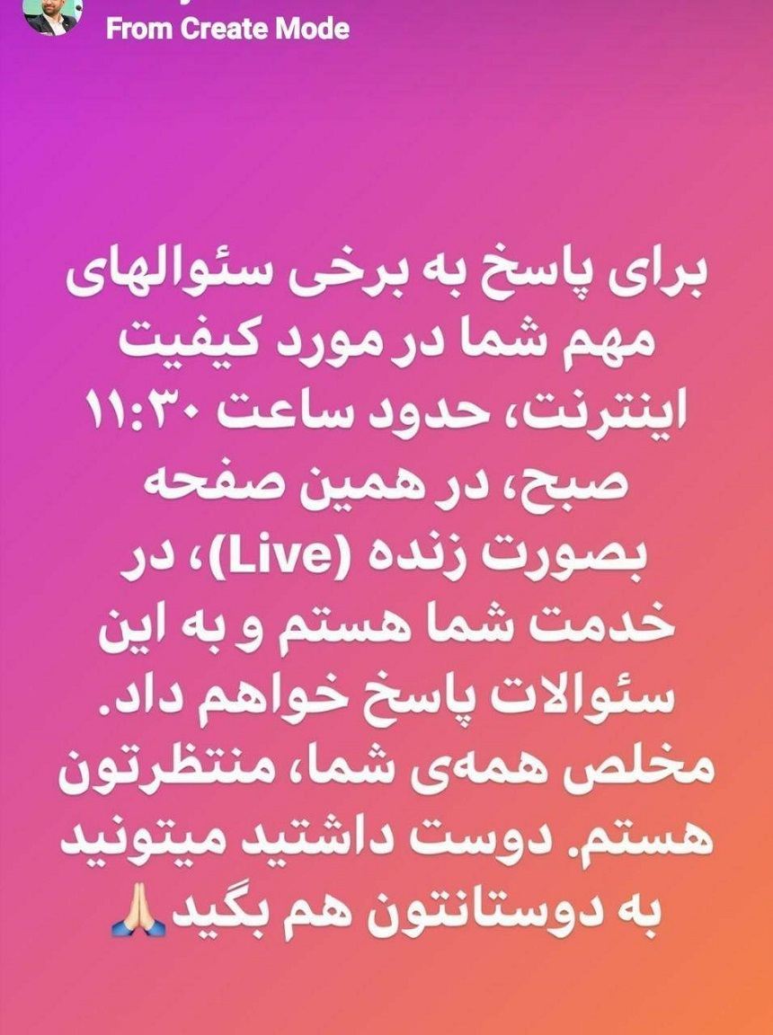 وزیر ارتباطات از پاسخ زنده(لایو) به سوالات کاربران در زمینه کیفیت اینترنت در صفحه اینستاگرام خود خبر داد.