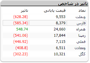 امروز نماد ارتباطات سیار ایران بیشترین اثر تقویتی در شاخص بورس را داشته و نمادهای بانک ملت، پتروشیمی خلیجفارس، مپنا، ملی مس، توسعه معادن و فلزات و صنعتی گلگهر در کاهش شاخص کل بورس اثرگذار بودهاند.