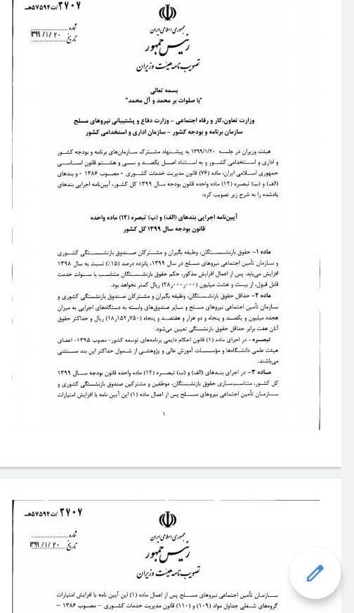 بر اساس مصوبه هیئت دولت حداقل حقوق بازنشستگان کشوری و لشکری تعیین شد.