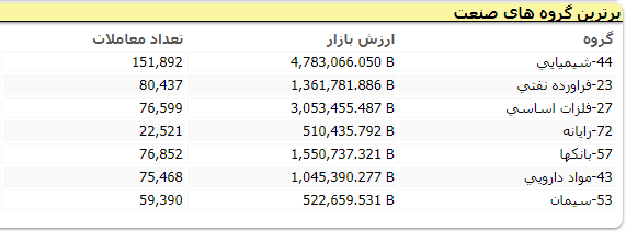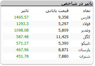 پتروشیمی تندگویان، هلدینگ صنایع معدنی خاورمیانه، پتروشیمی زاگرس و پتروشیمی مارون نسبت به سایر نمادها بیشترین تاثیر مثبت و در مقابل سهامی ذوب آهن اصفهان، فرابورس ایران و تولید نیروی برق دماوند نسبت به سایر نمادها بیشترین تاثیر منفی را در فرابورس داشتند.