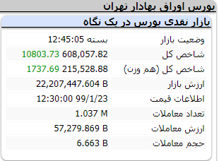 به گزارش سایت طلا ، شاخص کل بورس اوراق بهادار تهران، در پایان معاملات امروز 10 هزار و 803 واحد رشد کرده و به رقم 608 هزار و 57 واحد رسید که در نوع خود رکورد بی‌نظیری به شمار می‌رود.
