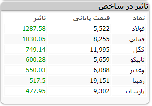 امروز عمده نمادهای مهم بورسی در رشد شاخص کل بازار مؤثر بودند که مهمترین این نمادها شامل فولاد مبارکه، ملیمس، گلگهر، هلدینگ تاپیکو، سرمایهگذاری غدیر، گروه مپنا و گسترش نفت و گاز پارسیان بودند.