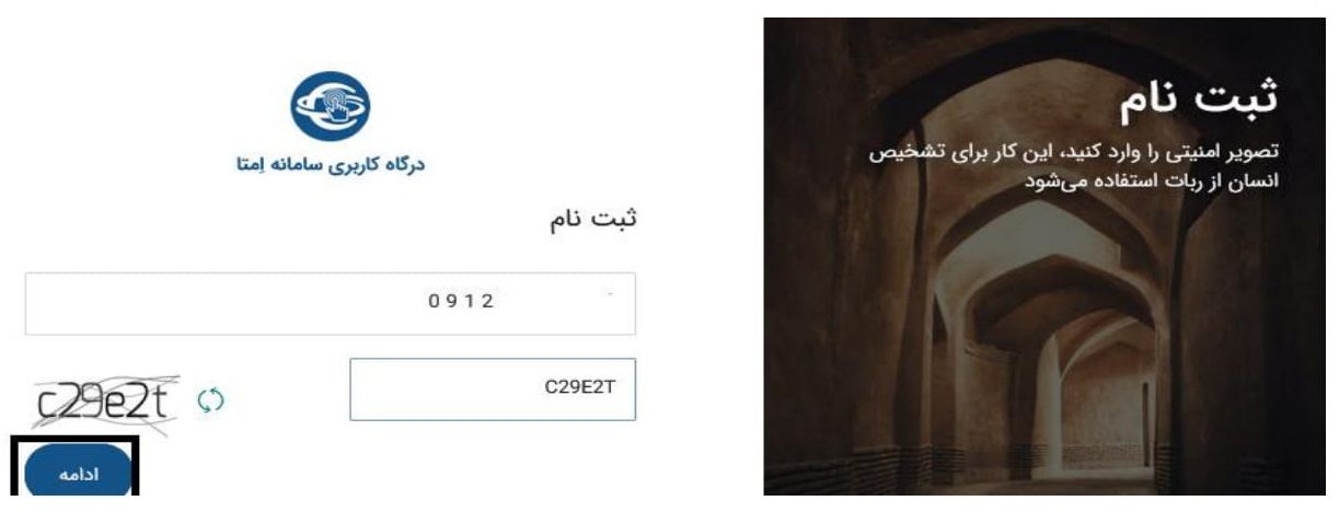۱ -پس از ورود به سامانه فروش اینترنتی ایران خودرو "ورود کاربر" و کلیک روی گزینه ثبت نام یا تنظیم رمز، اطلاعات مربوط به ثبت شماره موبایل مشتری در سامانه امتا مطابق با شکل ذیل رویت و پس از ثبت شماره موبایل و انتخاب گزینه "ادامه" مشتری به صفحه ثبت نام هدایت میگردد.