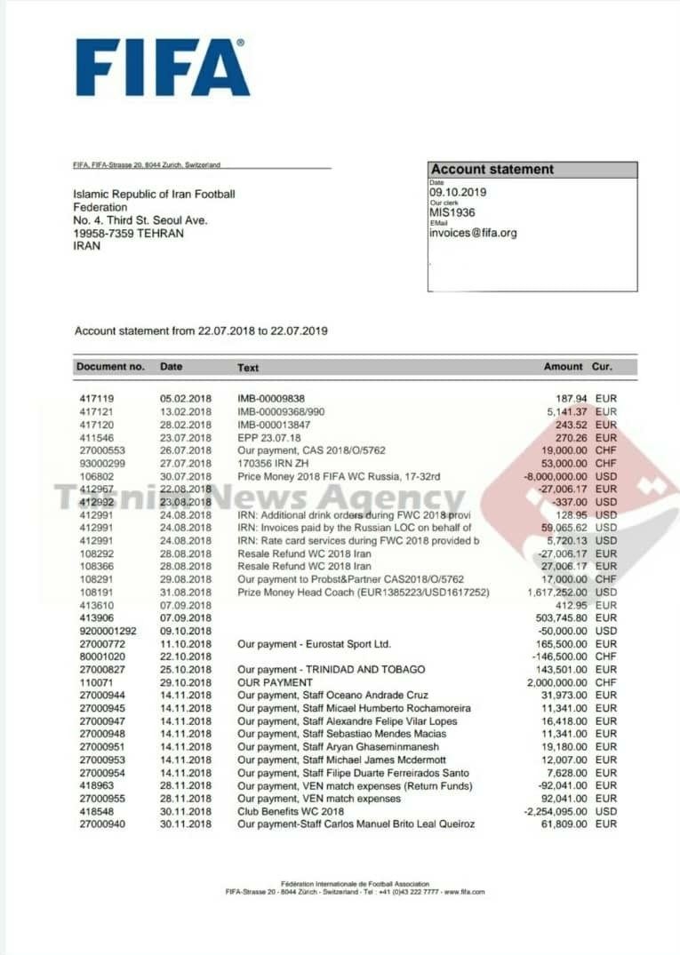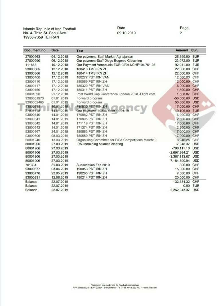 با این صورتحساب که تا تاریخ 22 جولای 2019 محاسبه و در تاریخ 9 اکتبر 2019 از سوی فیفا برای فدراسیون فوتبال ارسال شده است، باقیمانده حساب ایران نزد فیفا 2 میلیون و 262 هزار و 43 دلار است که از این مبلغ 2 میلیون و 254 هزار و 95 دلار پاداش باشگاهها بوده که مربوط به فدراسیون فوتبال نمیشود، یعنی باقیمانده حساب فدراسیون با کسر این مبلغ تنها 7 هزار و 948 دلار بوده است.