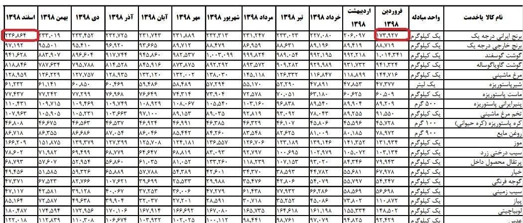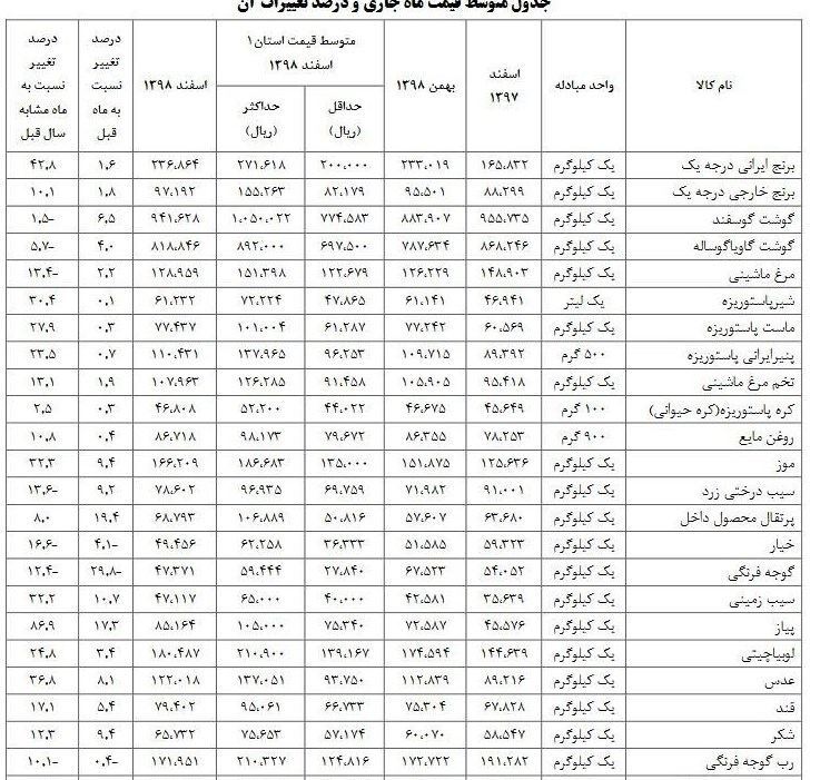 جزئیات تغییر قیمت اقلام خوراکی در اسفند ۹۸ + جدول