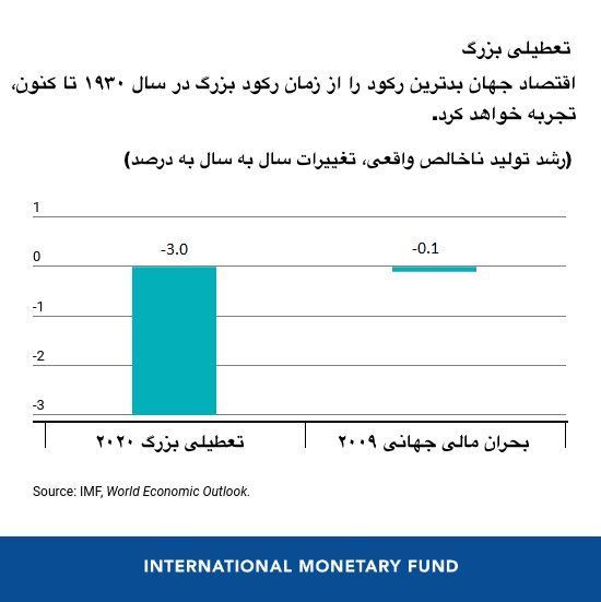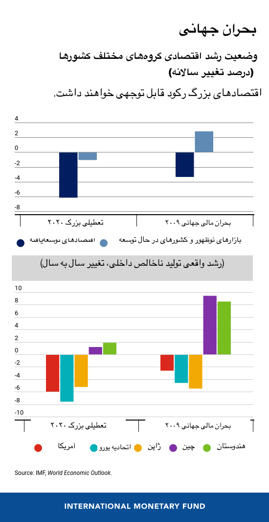 نمودار زیر که از پایگاه اینترنتی صندوق بین المللی پول به فارسی برگردانده شده، وضعیت رشد اقتصادی را در زمان تعطیلی بزرگ سال ۲۰۲۰ در مقایسه با بحران مالی جهانی ۲۰۰۸-۲۰۰۹ نشان میدهد.