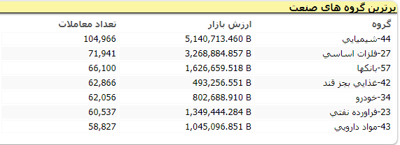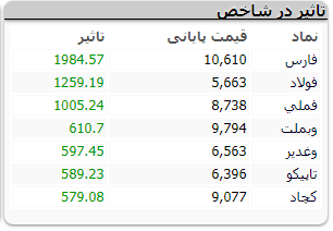 از میان ۳۰۶ نماد مثبت و ۳۷ نماد منفی، صنایع پتروشیمی خلیج فارس، فولاد مبارکه اصفهان، ملی صنایع مس ایران، بانک ملت، سرمایهگذاری غدیر، س. نفت و گاز و پتروشیمی تامین و معدنی و صنعتی چادرملو نسبت به سایر نمادها بیشترین تاثیر مثبت را روی بورس گذاشتند.
