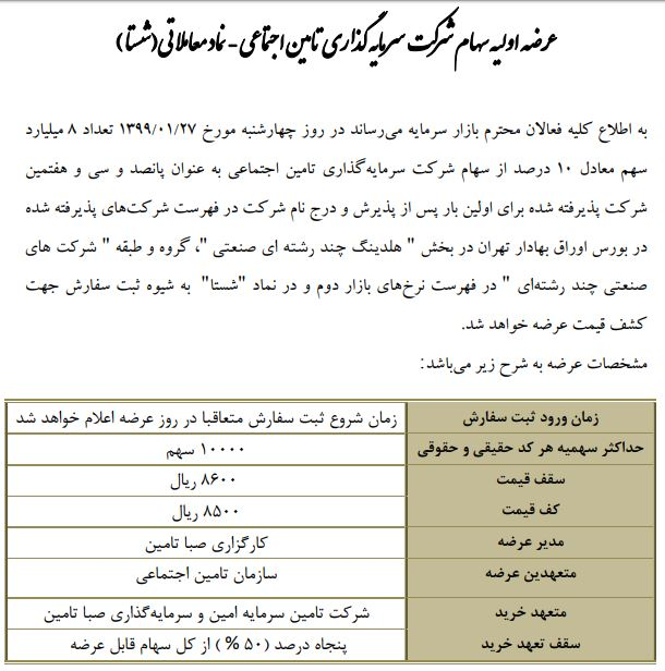 امروز همچنین عرضه اولیه 8 میلیارد سهام شرکت سرمایهگذاری تامین اجتماعی، شستا، در بورس تهران انجام شد که این مقدار 10 درصد از کل سهام شستا به شمار میرود که بعد از 35 سال شکلگیری شستا برای اولین بار در بورس تهران عرضه اولیه میشود.