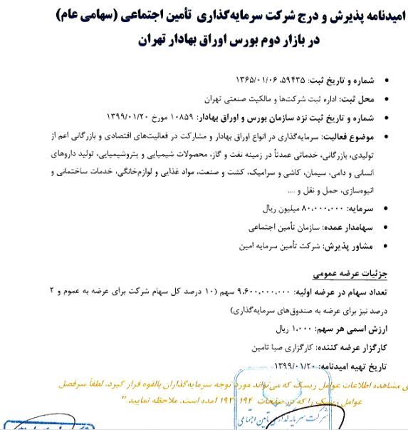 شرکت سرمایهگذاری تامین اجتماعی که از سال قبل فرایند پذیرش در بورس تهران را شروع کرده بود بعد از احراز کامل شرایط، ۲۰ فروردین سال جاری در کمیته پذیرش با پلاک ۵۳۷ پذیرفته شد و در بازار دوم معاملات و در ﺑﺨﺶ هلدینگ چند رشتهای صنعتی درج شد.
