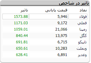 سهامی ذوب آهن اصفهان، پتروشیمی زاگرس، فولاد هرمزگان جنوب، هلدینگ صنایع معدنی خاورمیانه، صنایع ماشین های اداری ایران، گروه توسعه مالی مهر آیندگان و توسعه مولد نیروگاهی جهرم نسبت به سایر نمادها بیشترین تاثیر مثبت را در فرابورس داشتند.
