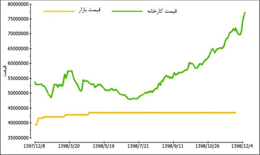 با توجه به تغییرات قیمت ورق خودرو که در نمودار زیر آنرا برای خودرو تیبا مشاهده میکنید، قیمت خودرو در طی یک سال گذشته ۴۵ درصد رشد را تجربه کرده است و از لحاظ عددی میزان رشد آن کمتر از ورق بوده است.