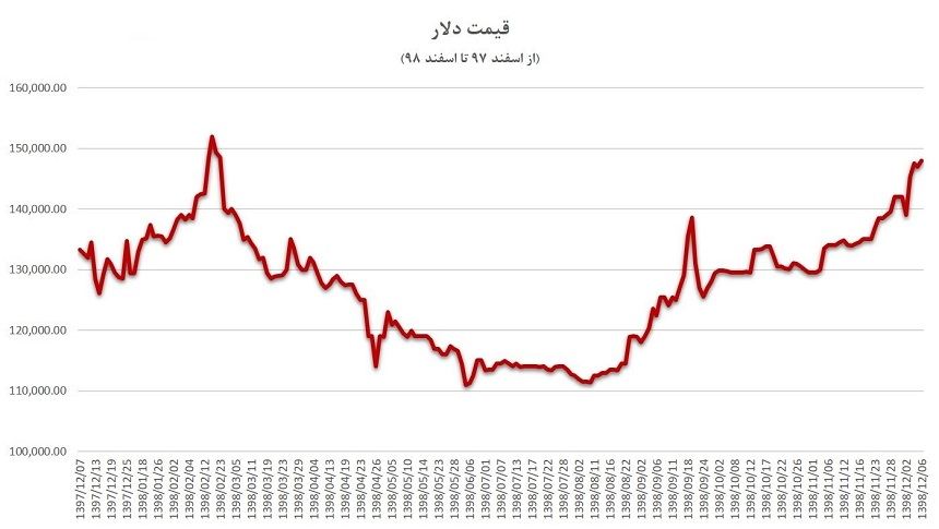 پارامتر بعدی که باید در پیشبینی قیمت خودرو در سال ۹۹ در نظر داشته باشیم، نوسانات قیمت دلار است. این پارامتر با توجه به وابسته بودن برخی قطعات خودرو به واردات از سوی کشورهای دیگر، پارامتر موثر و مهمی است که قیمت خودرو را تحت تاثیر خود قرار میدهد؛ بنابراین موازی با نوسانات چشمگیر دلار، شاهد نوسانات قیمت خودرو نیز خواهیم بود. در نمودار زیر، تغییرات قیمت دلار را میتوانید ببینید و میتوانید همبستگی آنرا با تغییرات قیمت خودرو در بازار آزاد (نمودار قبل) مقایسه کنید.