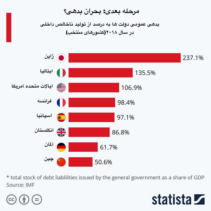 نمودار زیر که از پایگاه دادهپردازی استاتیستا به فارسی برگردانده شده، میزان بدهی دولتها را در سال ۲۰۱۸ نشان میدهد.
