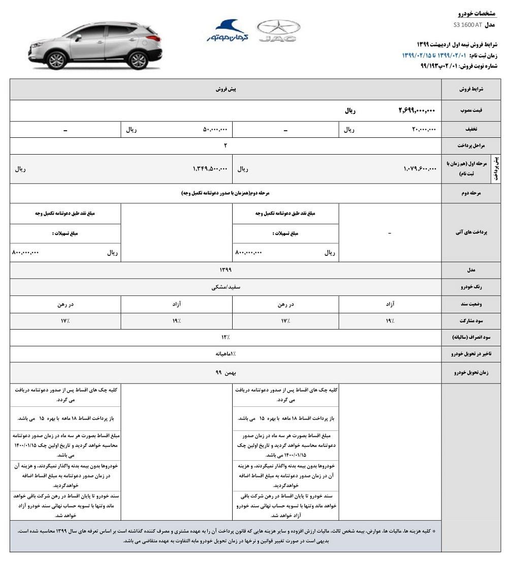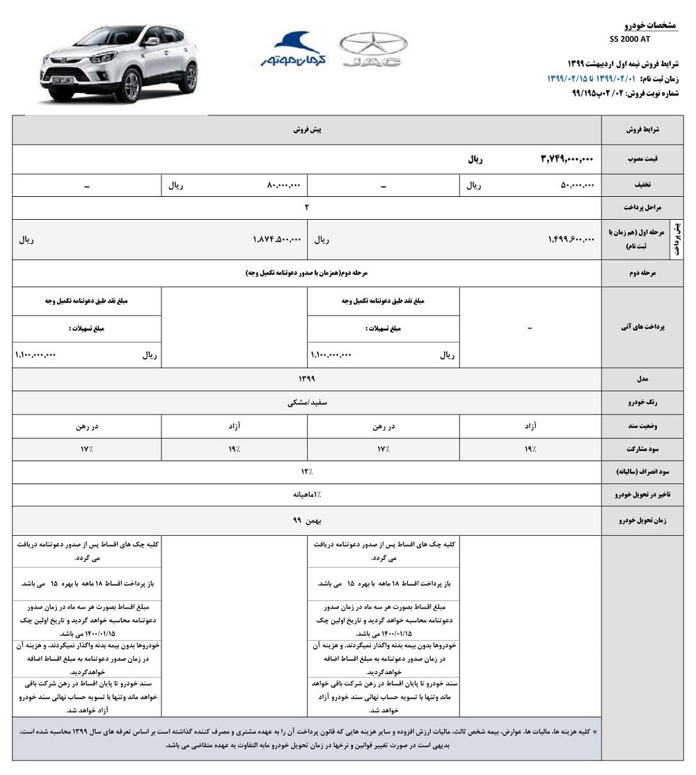 هر ۲ محصول جک S۳ و جک S۵ را میتوان با تسهیلات ۸۰ و ۱۱۰ میلیون تومانی نیز ثبت نام کرد که اقساط خودرو از سال ۱۴۰۰ آغاز خواهد شد.