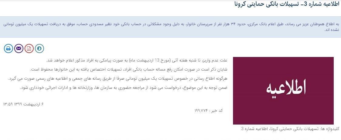 امروز وزارت کار طی اطلاعیه ای اعلام کرد: به اطلاع هموطنان عزیز می رساند، طبق اعلام بانک مرکزی، حدود 34 هزار نفر از سرپرستان خانوار، به دلیل وجود مشکلاتی در حساب بانکی خود نظیر مسدودی حساب، موفق به دریافت تسهیلات یک میلیون تومانی نشده اند.