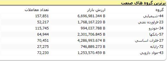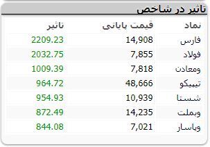 امروز نمادهای پتروشیمی خلیج فارس، فولاد مبارکه، توسعه معادن و فلزات، سرمایه‌گذاری دارویی تأمین، بانک ملت، بانک پاسارگاد و گسترش نفت و گاز پارسیان بیشترین اثر افزایش در شاخص بورس را داشته‌اند.