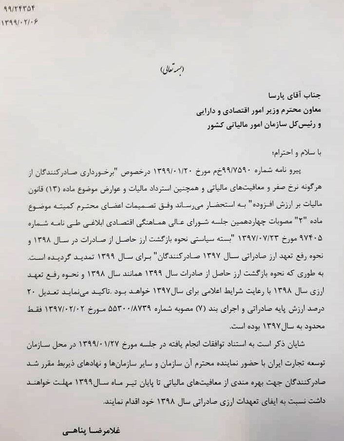 در این مکاتبه آمده است، پیرو نامه بیستم فروردین سال جاری در خصوص برخورداری صادرکنندگان از هرگونه نرخ صفر و معافیتهای مالیاتی و همچنین استرداد مالیات و عوارض موضوع ماده 13 قانون مالیات بر ارزش افزوده به استحضار می رساند وفق تصمیمات اعضای محترم کمیته موضوع ماده 2 مصوبات چهاردهمین جلسه شورای عالی هماهنگی اقتصادی ابلاغی طی نامه مورخ بیست و سوم مهرماه بسته سیاستی نحوه بازگشت ارز حاصل از صادرات در سال 98 و نحوه رفع تعهد ارزی صادراتی سال 97 صادرکنندگان برای سال 99 تمدید گردید.