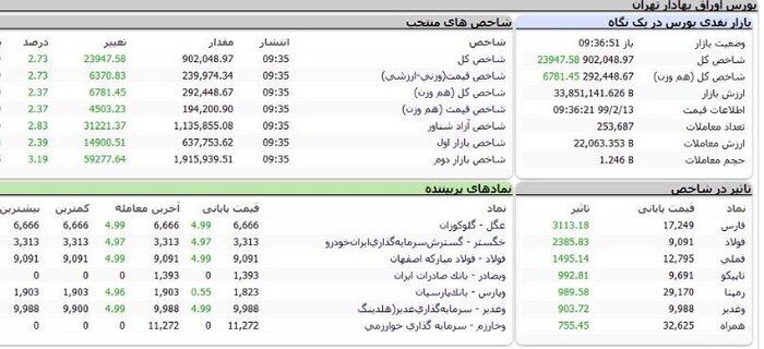 شاخص بازار اول بورس که معاملات خرد انجام می‌شود، با افزایش 27 هزار و 67 واحد به رقم 649 هزار و 921 واحد رسید و شاخص بازار دوم بورس که معاملات بلوکی و عمده انجام می‌شود با افزایش بی‌‌سابقه 83 هزار و 442 واحد به رقم بی‌سابقه یک میلیون و 940 هزار و 103 واحد رسید.