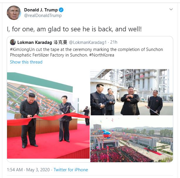 رئیسجمهور آمریکا به حضور دوباره رهبر کره شمالی در مقابل دوربینها بعد از بیست روز غیبت، واکنش نشان داد.
