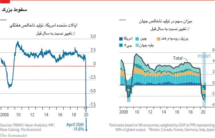 نمودار زیر، این وضعیت را روی خطوط آماری نشان میدهد. میزان تولید ناخالص هفتگی بزرگترین اقتصاد جهان، در ۲۵ ماه آوریل ۱۱.۶ درصد سقوط کرد. همچنین پیشبینی میشود که سهم آمریکا در تولید ناخالص جهان در سال ۲۰۲۰، کمتر از منفی یک درصد باشد. چین با رقمی نزدیک به ۰.۳ درصد، بیشترین سهم را خواهد داشت. با وجودیکه قرنطینه در بسیاری از کشورهای جهان در حال کاهش یافتن است، اوضاع اقتصاد سختتر هم خواهد شد؛حداقل در جهان ثروتمند.