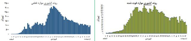 _. در مواردی که تغییرات ناهمگن شاخصهای روند ابتلا و مرگ و یا تغییرات بیش از حد انتظار هر کدام از دادههای ابتلا و مرگ دیده شد، رفتار ناسازگار دادهها وجود دارد و تحلیل بهتر را در روزهای بعد و با دادههای درستتر میتوان ارائه داد. وجود ناسازگاری دادهها به این معنا است که دادهها به خوبی قابل تفسیر نیستند و علل مشاهده آن میتواند متفاوت باشد. از جمله دلایل بروز ناسازگاری میتوان به ثبت غیر دقیق روزانه دادهها توسط استانها، وجود ترکیبی از چند الگوی اپیدمی در استان یعنی شروع اپیدمی در نقطهای از استان و اتمام اپیدمی در نقطه دیگر و یا مهاجرتها به داخل استان و یا خروج از استان اشاره کرد. البته باید کم شماری موارد و ثبت با تأخیر بیماران به صو رت جدی پیگیری شود.