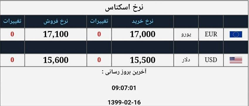 همچنین قیمت هر اسکناس یورو برای خرید ۱۷ هزار تومان و برای فروش ۱۷,۱۰۰ تومان است.