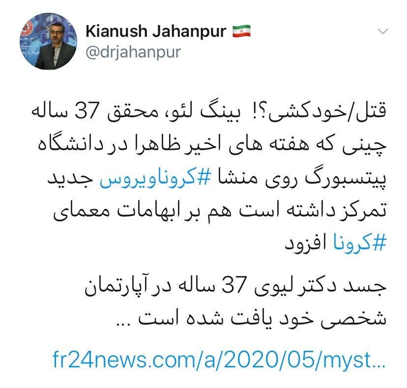 قتل دانشمندی که روی منشأ ویروس کرونا تحقیق میکرد /واکنش سخنگوی وزارت بهداشت به مرگ محقق چینی که بر روی منشأ کرونا تمرکز داشت