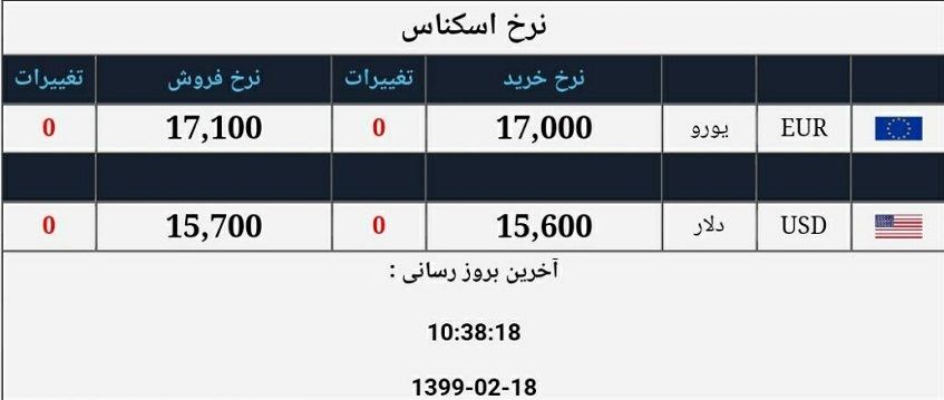 به گزارش سایت طلا ، قیمت دلار برای فروش در صرافی ملی، ۱۵،۷۰۰ تومان اعلام شد. همچنین این صرافی‌ها دلار را از مردم با قیمت ۱۵،۶۰۰ تومان خریداری می‌کنند.