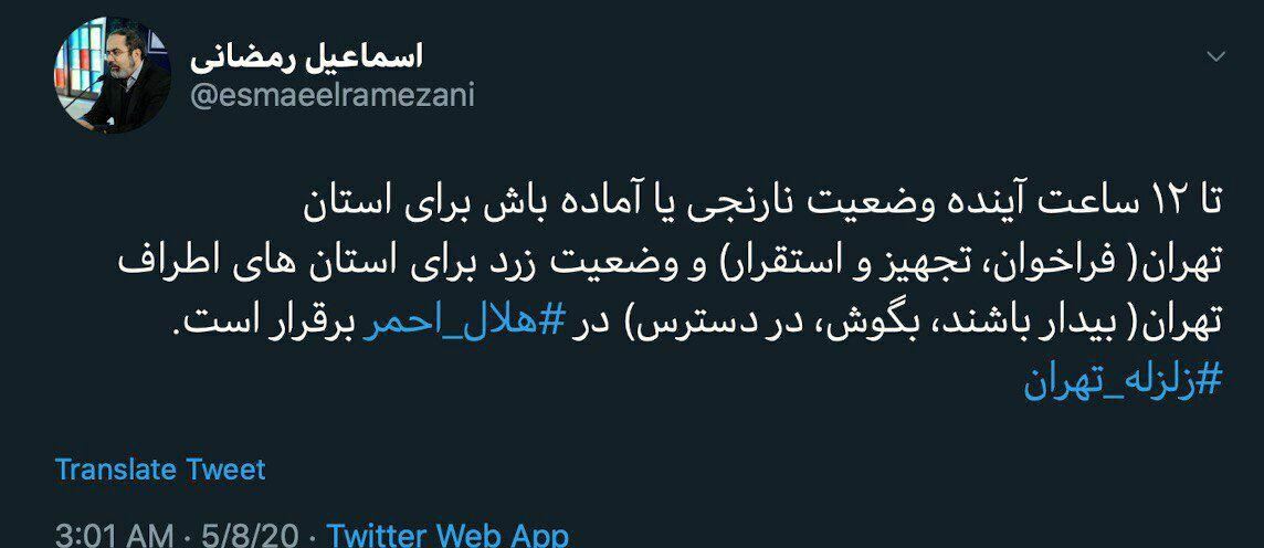 ترافیک نیمه سنگین در آزاد راه کرج- تهران/اعلام وضعیت نارنجی در تهران/دستور آمادهباش به یگانهای ارتش درپی زلزله تهران/زلزله تهران| ۲ کشته و ۲۳ مصدوم