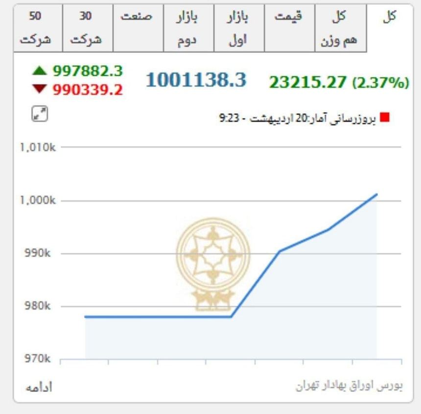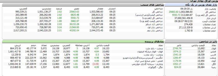 بر اساس این گزارش تا زمان تنظیم این خبر (۹:۲۰) شاخص کل با ۲۵ هزار و ۶۶۳ واحد رشد به عدد یک میلیون و سه واحد رسید.
