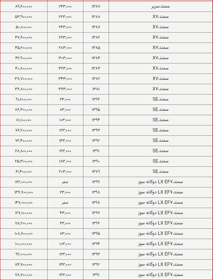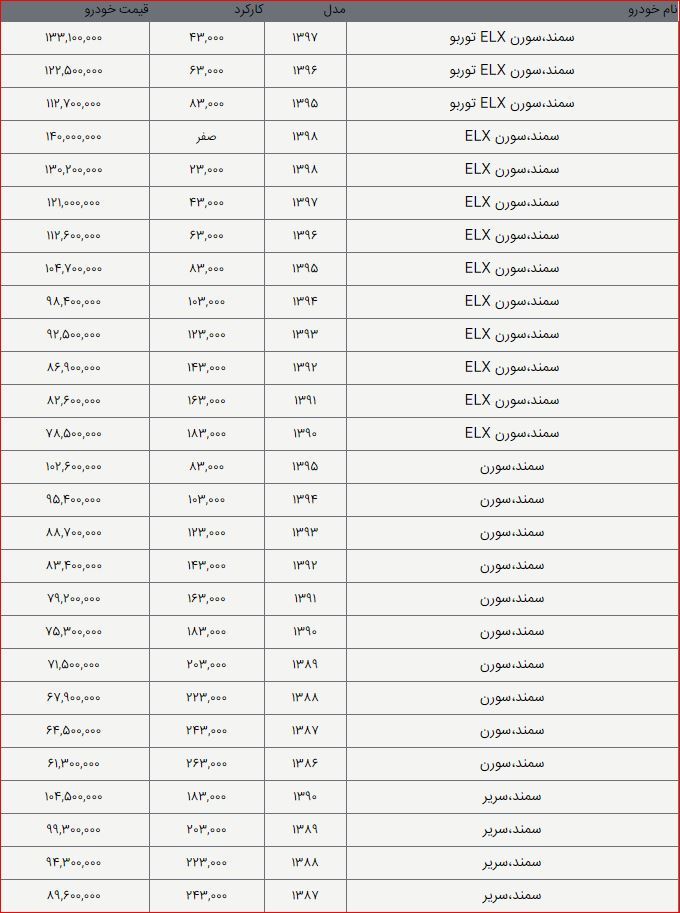 برای مشاهده قیمت انواع خودرو سمند صفر و کارکرده جدول زیر را بررسی کنید.