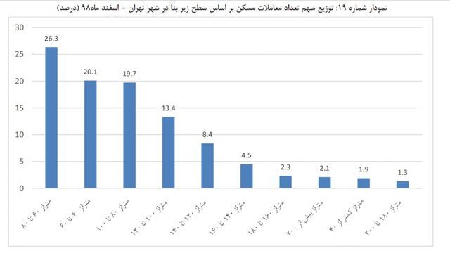 همچنین بررسی متراژ خانه های معامله شده در زمستان ۱۳۹۸ نشان می دهد تنها ۱۲ درصد از معاملات مربوط به ملک هایی با متراژ کمتر از ۵۰ متر بوده است. در مقابل ۶۱ درصد از معاملات را خانه هایی تشکیل می دهند که متراژی بین ۵۰ تا ۱۰۰ متر دارند. ۲۱ درصد از معاملات مربوط به ملک هایی با متراژ ۱۰۰ تا ۱۵۰ متر و تنها ۵ درصد و ۱ درصد از معاملات به ترتیب مربوط به خانه هایی با متراژ بین ۱۵۰ و ۲۵۰ متر و بالای ۲۵۰ متر است.