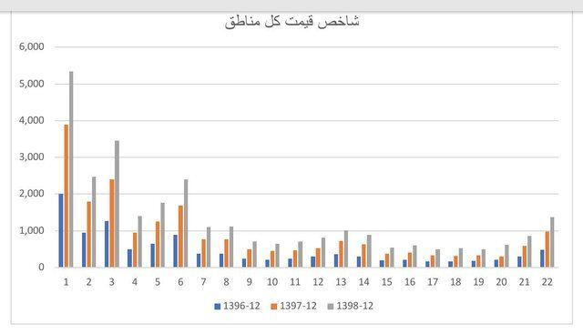 همچنین از اسفند ۹۷ تا اسفند ۹۸ مناطق ۲۰، ۱۸، ۱۲، ۱۷ و ۱۹ به ترتیب با ۱۰۱ درصد، ۷۰ درصد، ۵۴ درصد، ۵۱ درصد و ۴۹ درصد افزایش دارای بیشترین رشد و مناطق ۱، ۲، ۱۳، ۱۴ و ۲۲ به ترتیب با افزایش ۳۷ درصد، ۳۸ درصد، ۳۹ درصد، ۴۰ درصد و ۴۰ درصد کمترین افزایش را از اسفند ۹۷ تا اسفند ۹۸ داشته اند.