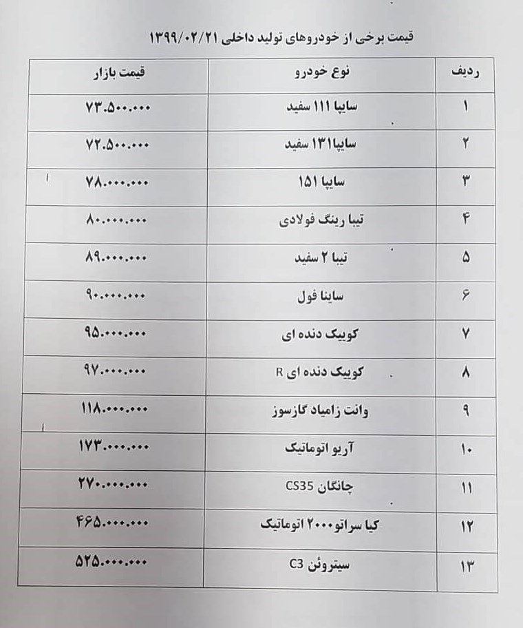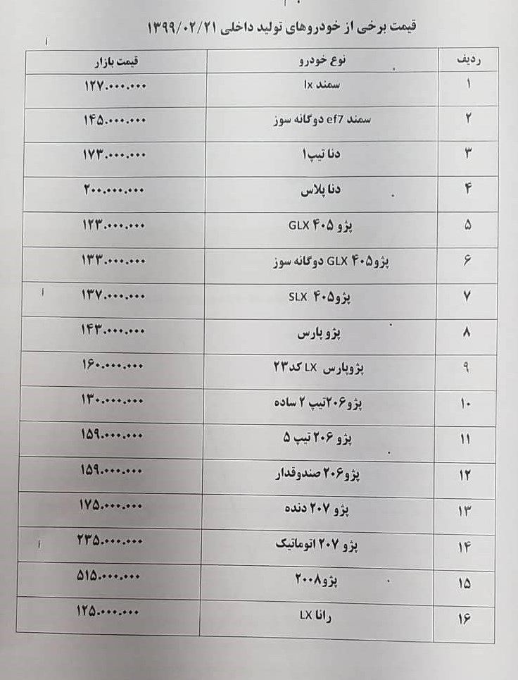 قیمت برخی خودروهای داخلی در بازار امروز به شرح زیر است: