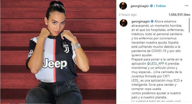 جورجینا رودریگس، نامزد کریستیانو رونالدو در صفحه اینستاگرامش اعلام کرد پول فروش چهار پیراهن امضا شده همسرش را به بیمارستانهای اسپانیا اهدا میکند. اسپانیا در حال گذراندن وضعیتی بحرانی در مقابله با ویروس کروناست و پس از ایالات متحده آمریکا از نظر تعداد مبتلایان به این ویروس، در رده دوم جهان است.