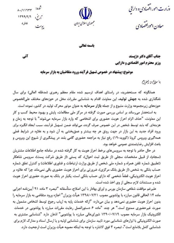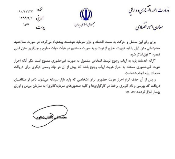 طبق نامه محمد علی دهقان دهنوی معاون اقتصادی وزیر اقتصاد که 6 اردیبهشت ماه ارسال شده، سازمان بورس مخالف احراز هویت غیرحضوری است و در این زمینه از خود مقاومت نشان میدهد.