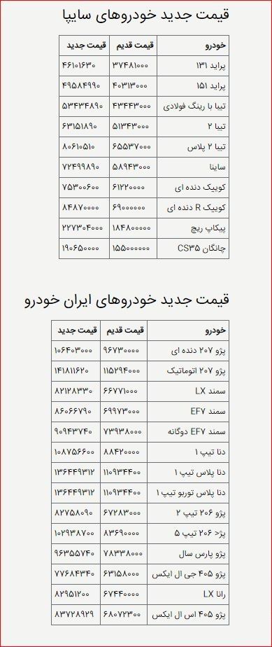 بر این اساس خودروهای شرکت ایران خودرو با 10 درصد و خودروهای شرکت سایپا با 23 درصد افزایش قیمت به فروش خواهند رسید.
