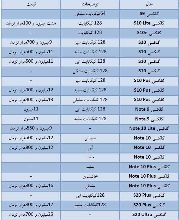 گرانترین موبایل برند سامسونگ در ایران گلکسی S20 Ultra است با قیمت ۲۵ میلیون و ۷۰۰ هزار تومان. S20 پلاس را فعلا حدود ۱۷، ۱۸ میلیون تومان میفروشند. نوت ۱۰ پلاس کمی بیش از ۱۶ میلیون تومان فروخته میشود و خانواده S10 و نوت ۹ که در حقیقت مدلهای قدیمی سامسونگ محسوب میشوند، قیمتشان بالای ۱۰ میلیون است.