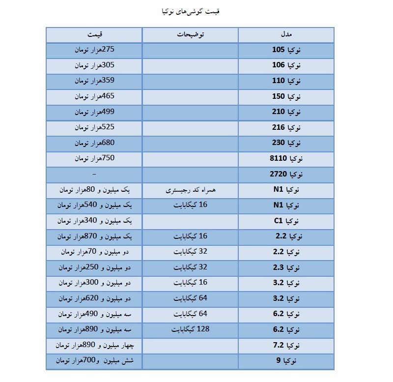قیمت گوشیهای نوکیا در بازار
