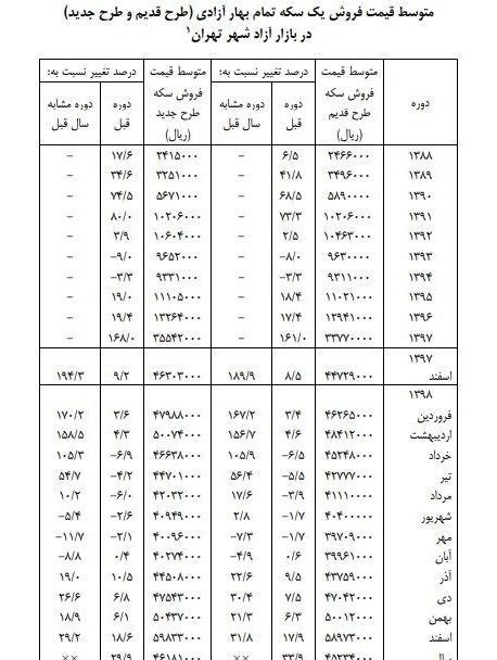 متوسط قیمت فروش یک سکه تمام بهار آزادی طرح قـدیم در بازار آزاد شهر تهران در سال 98 معادل 4 میلیون و 523 هزار و 400 و طرح جدید 4 میلیون و 618 هزار و 100 تومان بود که نسبت به سال 97 به ترتیب 33.9 درصد و 29.9 درصد افزایش یافته است.