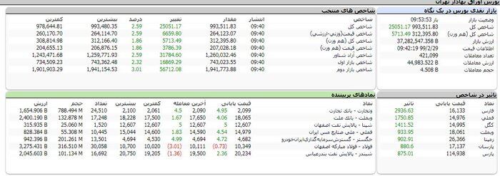 شاخص بازار اول بورس با رشد 1.9 درصد امروز به 740 هزار و 639 واحد رسید و شاخص بازار دوم بورس که معاملات عمده و بلوکی در آن انجام می‌شود با رشد 3.4 درصد به رقم یک میلیون و 949 هزار و 362 واحد رسید.