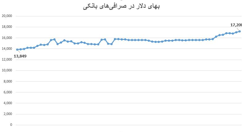 بهای دلار به نرخ صرافیهای بانکی هم از حدود 13 هزار و 850 تومان 26 بهمن 98 به 17 هزار و 200 تومان در 29 اردیبهشت ماه رسیده است که نشاندهنده رشد 24 درصدی ارز (ارز به نرخ صرافیهای بانکی) است.