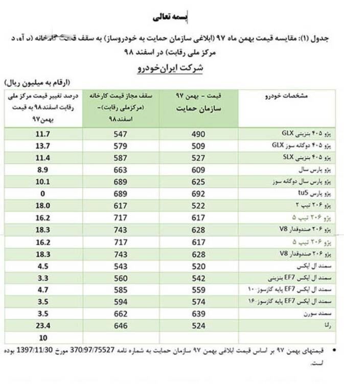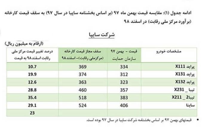 ۲. براساس محاسبات انجام شده در چارچوب فرمول و دستورالعمل مصوب شورا و با فرض ثابت گرفتن بهره وری و کیفیت خودروهای تولیدی در شرایط فعلی، محاسبات مرکز ملی رقابت نشان می دهد که قیمت های پایان اسفند ۱۳۹۸ نسبت به قیمت های اعلام شده در بهمن ماه ۱۳۹۷ طبق جدول ارسالی از سوی سازمان حمایت از مصرف کنندگان و تولیدکنندگان که به شورای رقابت اعلام شده و به تأیید ستاد تنظیم بازار رسیده است. برای شرکت ایران خودرو بطور میانگین ۱۰ درصد و برای شرکت سایپا ۲۳ درصد افزایش خواهد داشت.(مشروط بر آنکه میانگین وزنی افزایش با احتساب تیراژ از درصد های مذکور تجاوز ننماید.)